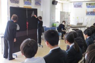 芥川龍之介の「蜘蛛の糸」をパネルシアターで読み聞かせしていただき,生徒たちは文学作品を普段と違った雰囲気で楽しんでいました。後方の生徒たちは立ち上がってのぞき込むようにして見入っていました。