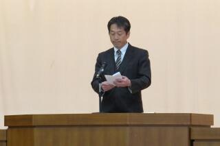 生徒会長からのあいさつの際には,美術部が作成した本年度の生徒会スローガンの垂れ幕が披露されました。