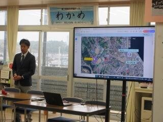 学年主任がモニターに地図を表示しながら、各訪問場所での避難場所、避難経路等を説明しました。